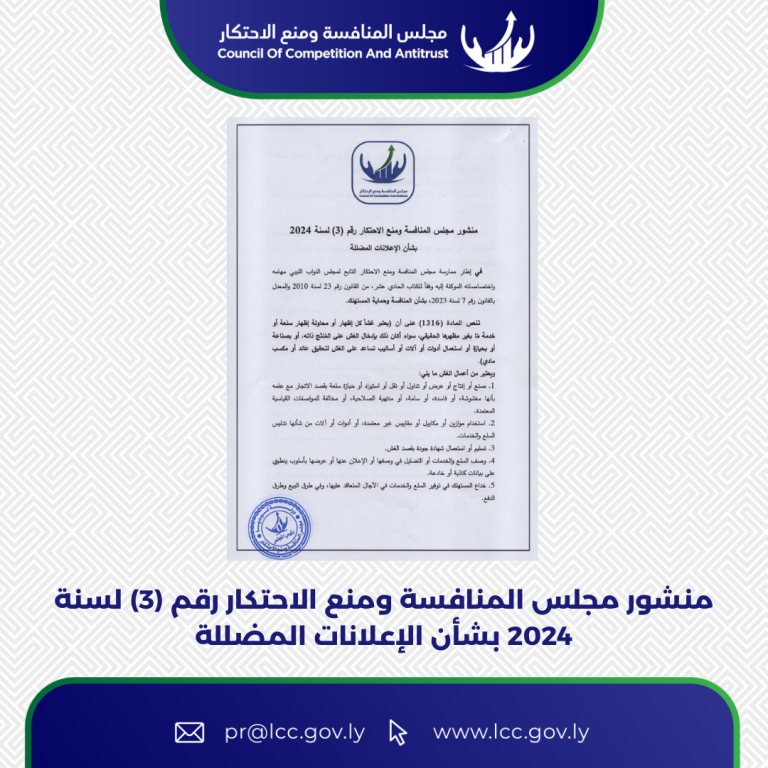 أصدر مجلس المنافسة ومنع الاحتكار التابع لمجلس النواب الليبي منشوراً جديداً رقم (3) لسنة 2024 بشأن الإعلانات المضللة، وذلك في إطار ممارسة المجلس لمهامه واختصاصاته الموكلة إليه وفقاً للقانون رقم 23 لسنة 2010 والمعدل بالقانون رقم 7 لسنة 2023 بشأن…
