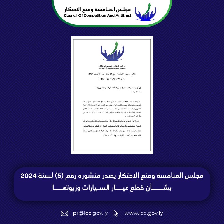 مجلس المنافسة ومنع الاحتكار يصدر منشوره رقم (5) لسنة 2024 بشأن قطع غيار السيارات وزيوتها للإطلاع إضغط على الرابط المرفق: